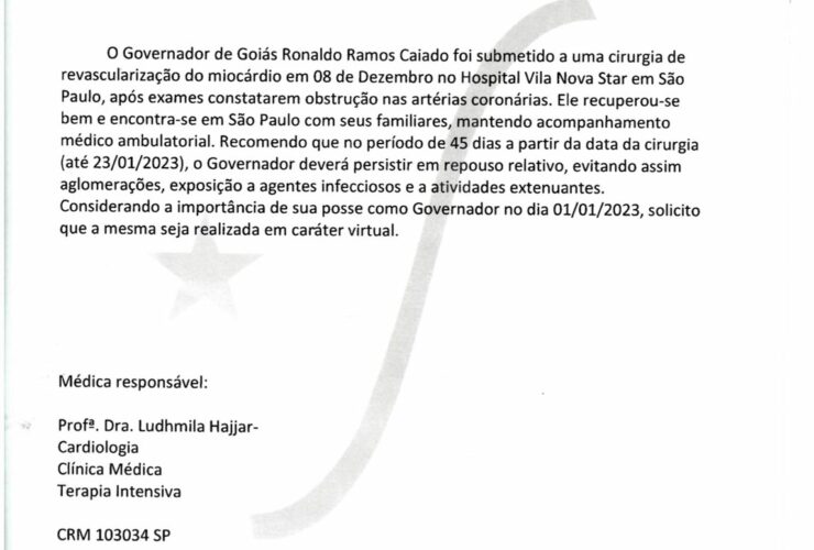 Atendendo recomendação médica, o governador Ronaldo Caiado deverá permanecer em repouso relativo por 45 dias a partir da data da cirurgia de revascularização do miocárdio, realizada em 8 de dezembro. O objetivo é garantir a total recuperação, evitando assim aglomerações e a consequente exposição a agentes infecciosos, como os vírus causadores da Covid-19, e atividades extenuantes. Por esse motivo, Caiado ...