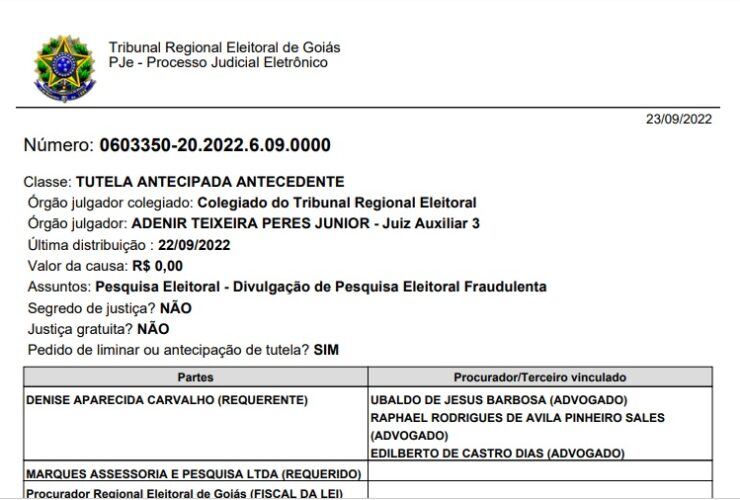 A Federação Brasil da Esperança de Goiás – FE Brasil/GO (PT, PCdoB e PV), por meio de sua presidente Katia Maria, suspendeu por liminar a PESQUISA EXATA registrada na Justiça eleitoral em 18/09/2022 sob o nº GO-00911/2022. O nome da candidata ao Senado pela Federação FE Brasil, DENISE CARVALHO nº 651 não estava presente na cartela do pesquisador/a, tornando a ...