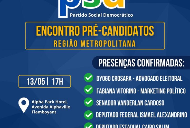 O PSD vai realizar nesta segunda-feira, 13, um grande encontro entre pré-candidatos da Região Metropolitana de Goiânia. A evento contará com a presença do presidente do PSD Goiás, e pré-candidato à prefeitura de Goiânia, senador Vanderlan Cardoso. O encontro que será realizado no Alpha Park às 17 horas, tem como objetivo treinar pré-candidatos e profissionais nas áreas jurídica e de ...