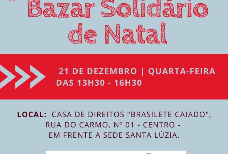 📝 A Secretaria Mun. das Mulheres, Juventude, Igualdade Racial e Direitos Humanos, realizará nesta quarta-feira (21/12) o Bazar Solidário de Natal, das 13h30 às 16h30, na própria sede da Casa de Direitos Brasilete Caiado, rua do Carmo, nº 01 - esquina com a rua da Abadia, em frente à sede Santa Lúzia. 🔆 O objetivo do Bazar Solidário é atender ...