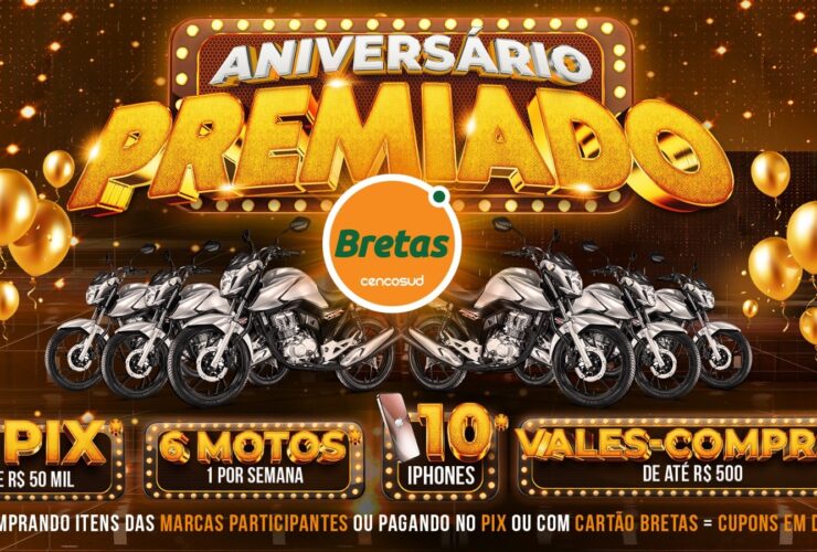 Promoção vai sortear vales-compras, motos, Iphones e ainda dois pix de R$ 50 mil O Bretas, rede varejista de Goiás e Minas Gerais, comemora, entre 2 de maio e 11 de junho, 69 anos. A promoção Aniversário Premiado terá duração de 41 dias e contará com ações de preços arrasadores e muitos sorteios de prêmios aos clientes. Será a primeira ...