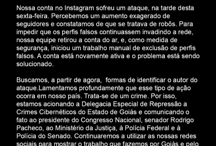 O senador Vanderlan Cardoso (PSD-GO) emitiu nota de oficial de esclarecimento sobre ataque à sua página no Instagram, ocorrido na última sexta-feira, 25. Leia nota na íntegra: “Nossa conta no Instagram sofreu um ataque, na tarde desta sexta-feira. Percebemos um aumento exagerado de seguidores e constatamos de que se tratava de robôs. Para impedir que os perfis falsos continuassem invadindo ...